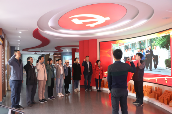在讲解员的带领下,我们的学习团队首先参观了三涧溪乡村振兴展馆。讲解员向我们展示了习近平总书记在视察三涧溪村时留下的一些珍贵的图片资料。此外,通过纪实影像、图片视频等多媒体形式详细了解了三涧溪村的历史人文,也了解到三涧溪村高淑贞书记发挥党员模范带头作用,以党风带家风等方式,用短短3年时间实现了三涧溪村由乱到治的转变,让所有人感受到了党建引领在带领群众脱贫攻坚中发挥的强大精神力量。高淑贞书记创建的宝盖头上一点为引领的“家”字型平安建设管理体系,生动地诠释了以党总支为首,实现以党风带家风、促民风,以党建为统领,强化班子建设,推动产业发展,保护生态环境,汇聚人才资源,建设文明村风家风的系统管理体系,给全体党员和老师留下了深刻的印象。最后,全体党员面对党旗庄严宣誓,重温入党誓词。