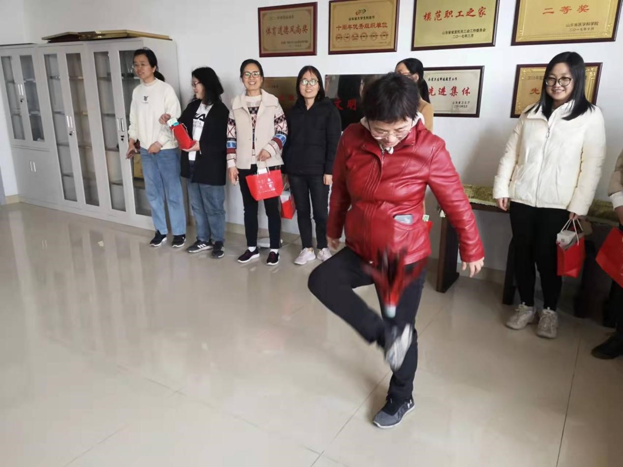 大家依次上场,一次性踢得最多者获胜。火红的毽子上下纷飞,场上精彩不断,不时响起阵阵喝彩声。最终以张洁、赵燕、王紫薇三位老师分列前三名。