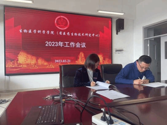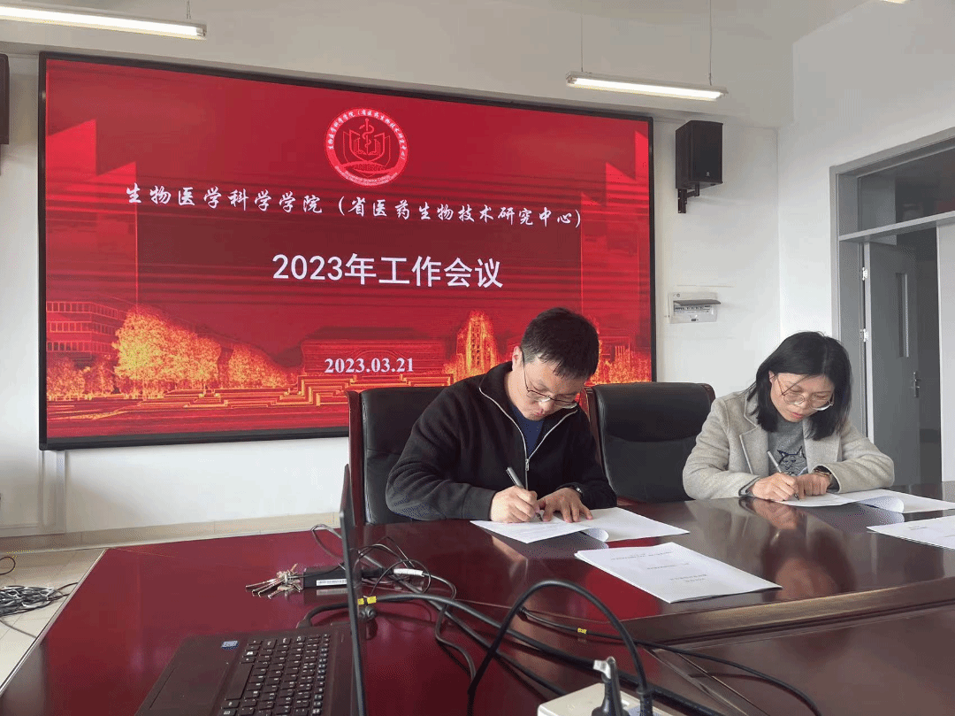 王林副经理与各教研室主任、潘继红书记与学工负责人分别签订2023年目标责任书。