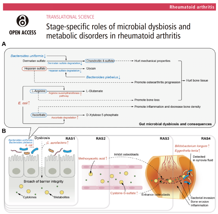 8月19日,beats365唯一官网入口官网韩金祥教授团队与华中科技大学宁康教授团队、山东大学张磊教授团队合作,在风湿病学排位第一的国际顶尖期刊《Annals of the Rheumatic Diseases》(IF 27.973)在线发表了合作研究的新成果,论文题为“Stage-specific roles of microbial dysbiosis and metabolic disorders in rheumatoid arthritis”。该成果报道了微生物紊乱与代谢物失调在类风湿性关节炎(RA)四个连续阶段中的作用,结合了16S基因测序技术,细菌分离技术和扫描电镜关节滑液进行分析。本研究首次聚焦于RA不同阶段,报道了肠道微生物失调与血液代谢物紊乱的阶段特性作用,特别是它们在第二、三阶段的促进炎症、骨质流失与骨侵蚀的作用,可作为今后针对不同RA阶段的临床实验的参考。此外该研究首次从多角度证明了关节滑液并非无菌状态,细菌的侵入发生在RA第四阶段。后续计划针对本研究所提出的机制进行多组学大队列实验验证以及开发相关益生元制品,对不同阶段的RA病人进行肠道微生态以及滑膜微生态调控。